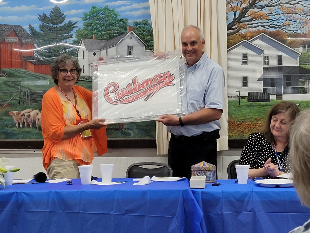 Tim Polenz receiving his gift as outgoing President from incoming President Donna Tibbitts.