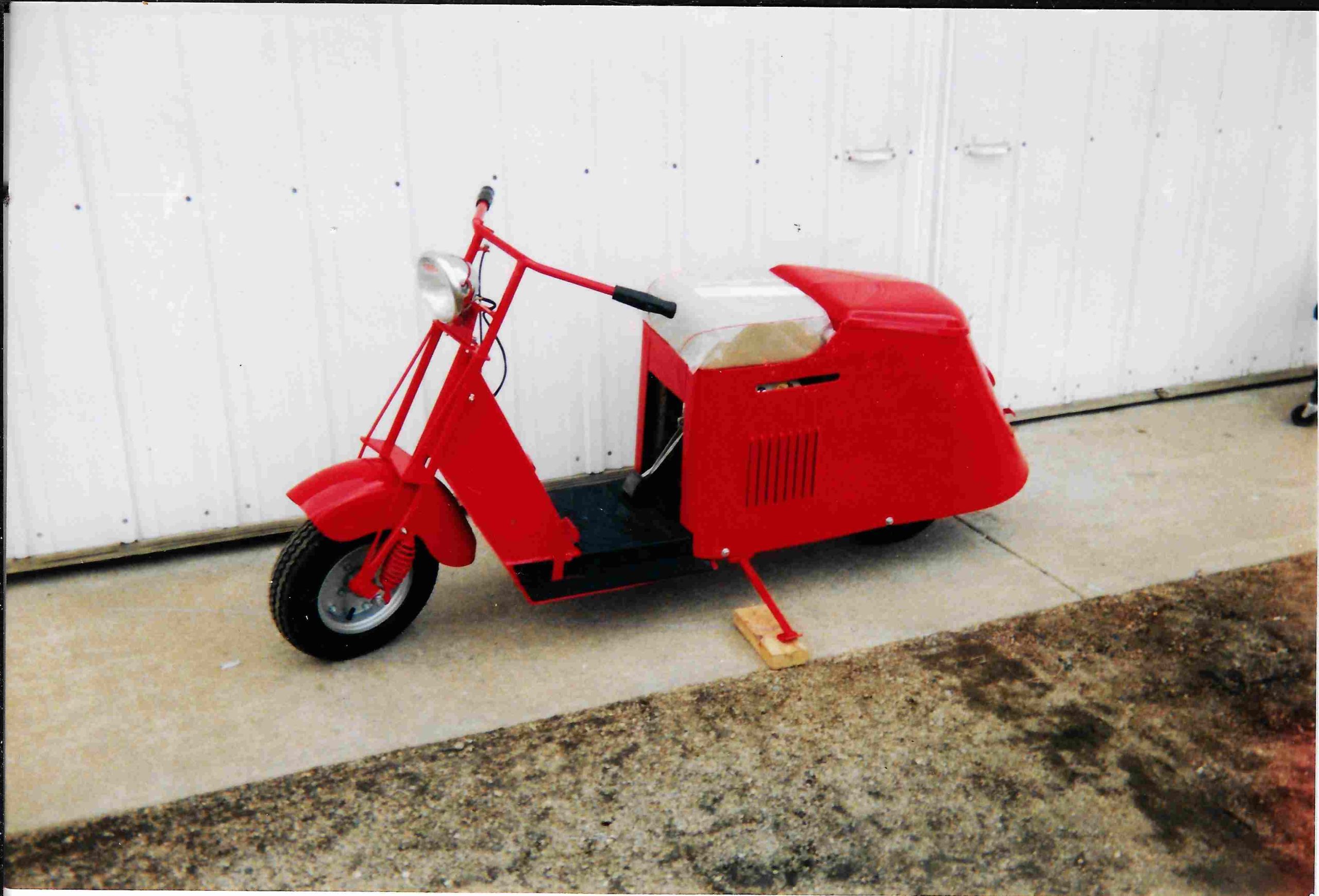 1953 firetruck red Cushman Husky. It has not been started for over 10 years and has been sitting as an admiration/conversation piece that visitors to our shop have loved seeing.
