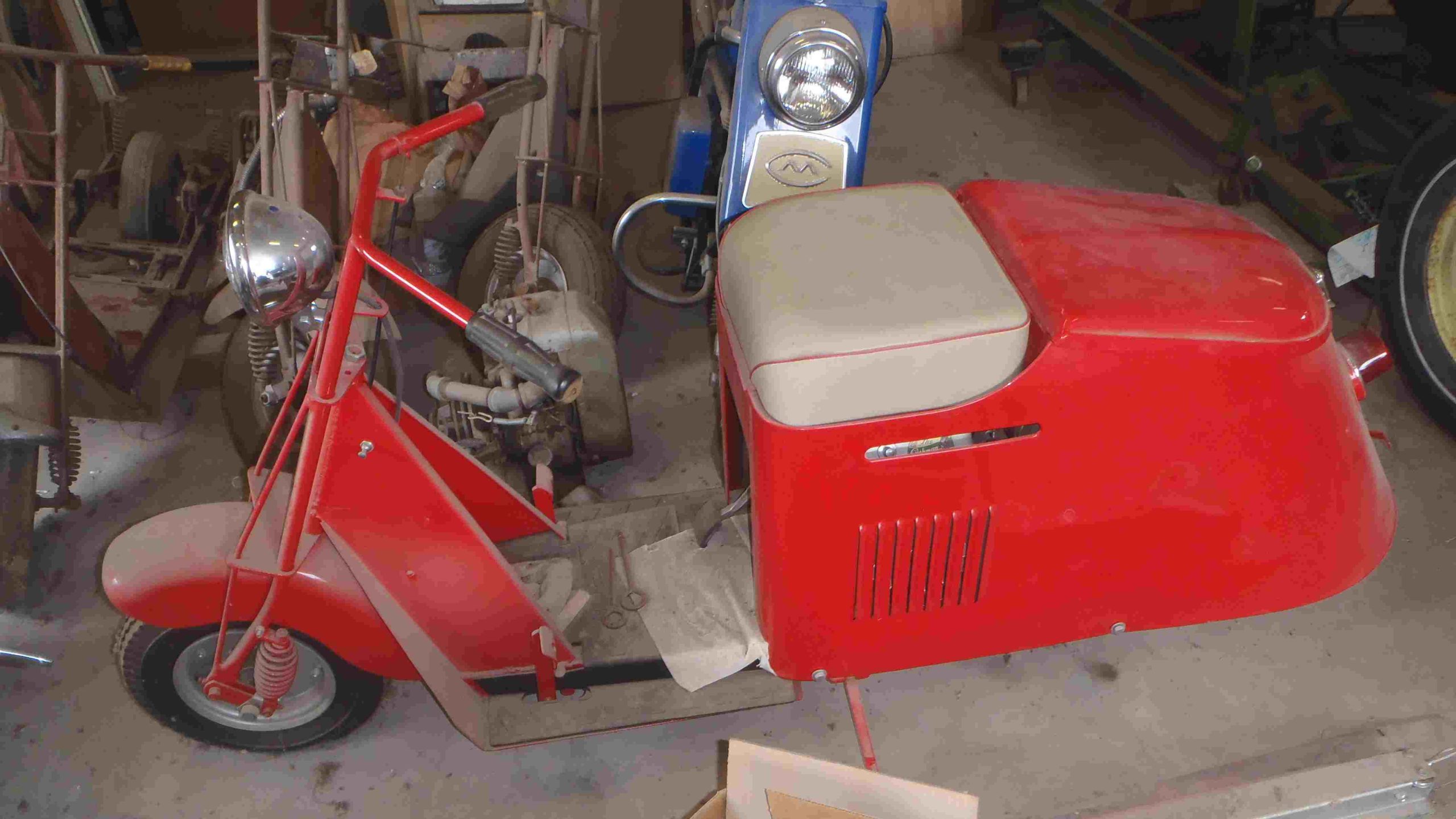 Late member, Robert Fuchs CCOA #6733, was restoring this scooter but did not finish. Rolling chassis is painted with new tires. Engine has been bored and oversize piston, rod, crank, and valves installed. Uninstalled parts, including many Carpenter repro parts on cart.  Cart not included. More photos available. Correct Nebraska title.